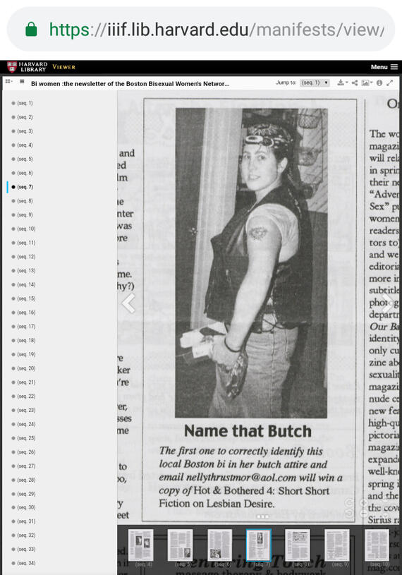 (ID: A picture of a butch woman in a newspaper, in black and white. The caption of the photo reads: Name that Butch. The first one to correctly identify this local Boston bi in her butch attire and email [email protected] will win a copy of ‘Hot & Bothered 4: Short Short Fiction on Lesbian Desire.’)Next, we have screenshots from the QZAP, which is an LGBT+ zine archive. The following are excerpts from 'Femmes Unite!' and 'Mutate'. (Warning: These screenshots and transcripts hold reclaimed words that may be triggering. Each word in the transcript was written by someone who can reclaim it. The basic takeaways of the screenshots will be below.)
