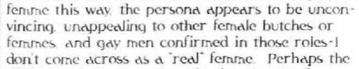 (ID: A screenshot of an archived zine, in black and white. It reads: "femme this way, the persona appears to be unconvincing, unappealing to other female butches or femmes and gay men confirmed in those roles-I don't come across as a "real" femme. Perhaps the". The text cuts off at the end.)