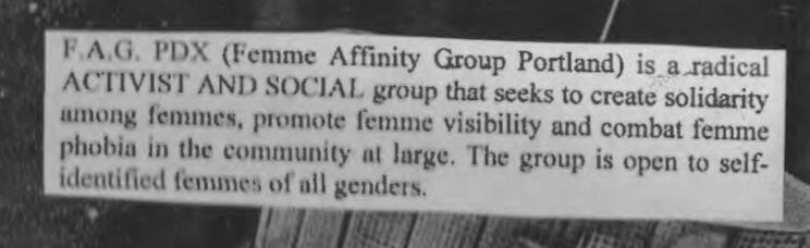 (ID: A screenshot of an archived zine, in black and white. It reads: "F. A. G. PDX (Femme Affinity Group Portland) is a radical ACTIVIST AND SOCIAL group that seeks to create solidarity among femmes, promote femme visibility and combat femme phobia in the community at large. The group is open to self-identified femmes of all genders."