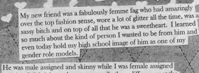 (ID: A screenshot of an archived zine, in black and white, with hearts above the text. It reads: "My new friend was a fabulously femme fag who had amazingly over the top fashion sense, wore a lot of glitter all the time, was a sassy bitch and on top of all that he was a sweetheart. I learned so much about the kind of person I wanted to be from him and even today hold my high school image of him as one of my gender role models.He was male assigned and skinny while I was female assigned". At the end the text cuts off.)