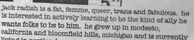 (ID: A screenshot of an archived zine, in black and white. It reads: "jack radish is a fat femme, queer, trans and fabulous. he is interested in actively learning to be the kind of ally he wants folks to be to him. he grew up in modeato, california and bloomfield hills, michigan and is currently". The text cuts off at the end.)