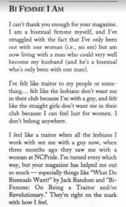 (ID: A screenshot of the letter in question, in black and white. The title reads: "Bi Femme I Am". In smaller text below the title, it reads, "I can't thank you enough for your magazine. I am a bisexual femme myself, and I've struggled with the fact that I've only been out with one woman (i.e., no sex) but am now living with a man who could very well become my husband (and he's a bisexual who's only been with one man).I've felt like a traitor to my people or something... felt like the lesbians don't want me in their club because I'm with a guy, and felt like the straight girls don't want me in their club because I can feel like for women. I don't belong anywhere.I feel like a traitor when all the lesbians I work with see me with a guy now, when three months ago they saw me with a woman at NCPride. I'm turned every which way, but your magazine has helped me out so much - especially things like "What Do Bisexuals Want?" by Jack Random and "Bi-Femme: On Being a Traitor and/or Revolutionary." They're right on the mark with how I feel.")Now, what's that on 'Bi-Femme: On Being a Traitor and/or Revolutionary'? Excellent question. There is a whole article on a bisexual using the femme identity in the 12th issue of 'Anything That Moves'! Here are a few select quotes from that article."My mama is a very smart woman. When I was 12 years old and I told her I was bisexual, all she said was, “Fine. As long as they don’t look like truck drivers.” I don’t mean that she was smart because she didn’t want me to date butch girls. She was smart because I think she knew that I was going to do it anyway. I was going to grow up to be a femme.""And as I got into my teens, I dated a lot of boys. All of them identified as bisexual or gay. Most of them were very, very femme.""Davis, Hollibaugh and Nestle include both male and female gender rebels within this definition. Femme, they say, seems perhaps to originate in a feminine love of queer sexual deviance, in general, of, as I’ve put it, “the boys inside my girls, and the girls inside my boys.”""The argument goes on to say that my femininity allows me the privilege of passing as heterosexual in general, at all times in which I am not with butch women or in queer spaces defined by their presence. These people defined queer as butch women or femme men – people who they saw as gender rebels, whose gender choice was an inversion of hegemonic standards.""... Femme is an attraction to queerness in any form that satisfies hunger. I believe that understanding this is crucial to opening up femme identity to independence from butch identity – as standing separate from our more visible partners. Butch girls can fuck boys casually, without threatening their (d-slur) identities? Well, I want that right too, as well as the right to define what that sex means to me."That's a whole lot of evidence, no? And we're not even done with this particular source!Once again from 'Anything That Moves', we have an article on the second annual Femme Conference in San Francisco. Amongst other things, this article includes the following quotes,""Well," I ventured, "to me, a femme is someone who takes the characteristics and stereotypes associated with being a woman and uses them as a source of personal power. Like, if someone is gonna stare at my body anyway, I'm damn well gonna make them look, and once I have their attention, I'm gonna tell them something. Get it?"""The conference organizers aimed to welcome every kind of person with more than a drop of femme in their souls, and to make plenty of space to talk about how we are, perform, or just love femme. Girls, boys, (d-slur)s, bi-femmes, (f-slur)-femmes, people from communities of color, young femmes, trans-femmes, lesbians, drag-femmes, working class and rich femmes, parents, fat femmes, and a few garden-variety freaks like me crowded the 33 workshops.""Femmes flocked to sessions like Femme As An Evolving Gender Identity; Bisexual Femmes and Femme Bisexuals; (f-slur) and Drag Femme..."Again, in historical bisexual readings, we have a whole passage on the politics of being a bisexual butch... That even claims that most bisexual women were assumed be femme! It even suggests that femme women face some sort of version of biphobia; stating that there was a stereotype that they weren't really interested in the same gender. The passage in question is titled "Too Butch to Be Bi (or You Can't Judge a Boy by Her Lover)", by Robin Sweeney, published in the book "Bisexual Politics" by Naomi Tucker, published in 1995. Here are a few choice quotes from this passage."I am a butch bisexual woman whose romantic and sexual partners are primarily other butch women, with some notable exceptions. Frequently, I like to appear as masculine as I can, often passing for male on the street. I like to keep my hair short. I'd rather wear jeans and boots than anything else.""But being a butch woman who is also bisexual can be difficult. It feels sometimes that the the idea is so challenging - since the assumptions in our communities are that all butch women are lesbian women and all femme women are bisexual women - that often a butch woman trying to come to terms with being bisexual is stuck.""The ideas about femmes (femme women aren't really interested in other women, and femme men aren't really interested in women at all) and butches (butches are always the aggressors in sex, whether they are men or women) permeate our queer culture. These ideas make it difficult for us to explore who we are and who we want to be."Going back to men in the butch / femme scene, we have these two quotes from a 2005 paper written about the rise of the macho biker image among gay men in the 60s:"The homosexual ‘man in leather’ remains one of the more disproportionately visible and controversial members of the LGBT community. He is the antithesis of the feminized drag queen. He seeks to defy the stereotype of homosexual men as effeminate, limp-wristed, and ‘nelly.