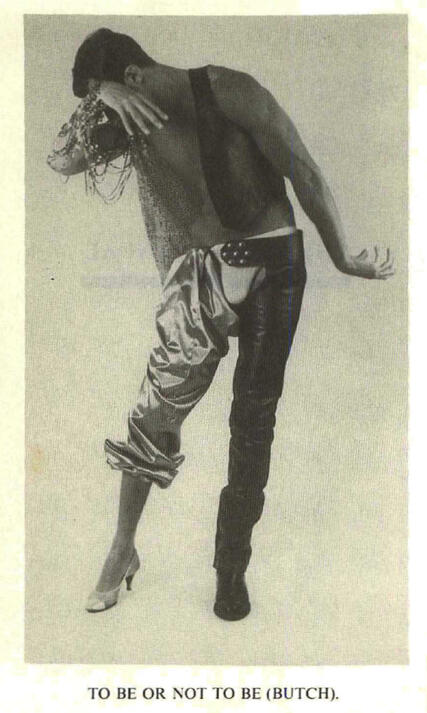 (ID: Another page from the manual. It features an image of a man, who is half-dressed in leather, and half-dressed in flowy, feminine clothing. He is covering his eyes with his arm. Underneath it, the photo is captioned, "TO BE OR NOT TO BE (BUTCH).")Now, going back to female bisexual butches, there is this newspaper from the 90s: