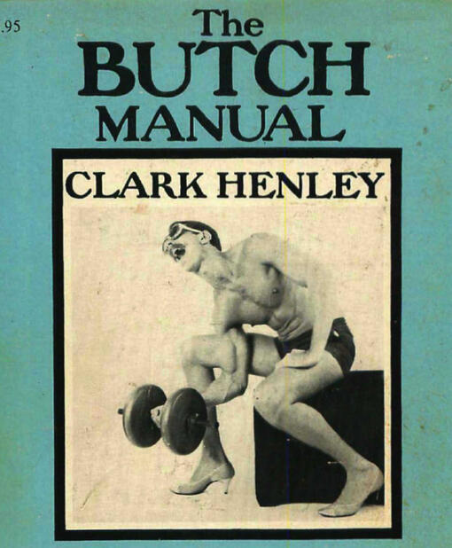 (ID: A screenshot of the cover of 'The Butch Manual.' It features the title on a blue background, above a yellowish photograph of a man with sunglasses and shorts sitting down and lifting a weight. Above the man, reads, 'Clark Henley', presumably the author.)WARNING FOR A NSFW JOKE IN THE FOLLOWING IMAGE / DESCRIPTION!