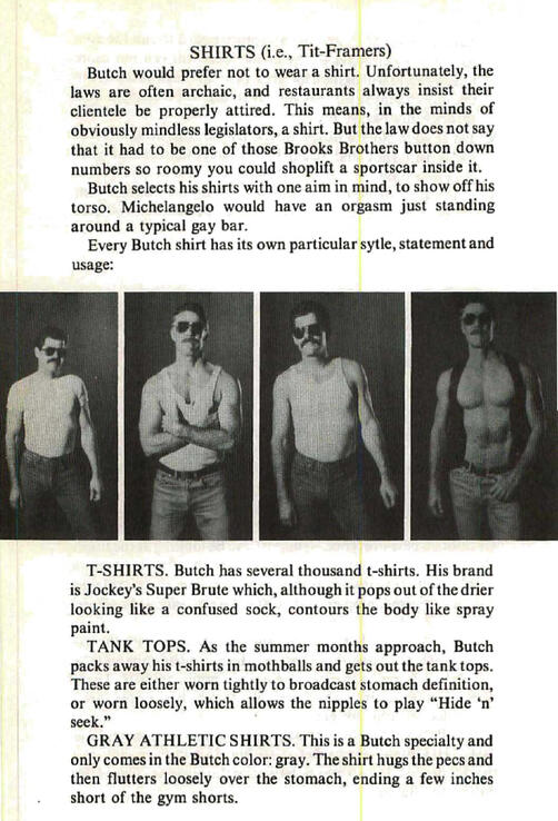 (ID: It is a page from the manual, which is text-heavy. It reads: "SHIRTS (i.e., Tit-Framers)Butch would prefer to not wear a shirt. Unfortunately, the laws are often archaic, and restaurants always insist their clientele be properly attired. This means, in the minds of obviously mindless legislators, a shirt. But the law does not say that it had to be one of those. Brooks brothers button down numbers so roomy you could shoplift a sportscar inside it.Butch selects his shirt with one aim in mind, to show off his torso. Michelangelo would have an orgasm just standing around a typical gay bar.Every butch shirt has its own particular style, statement and usage:"There are four black-and-white images of men with sunglasses, all wearing different styles of shirts. The text underneath the images reads:"T-SHIRTS. Butch has several thousand t-shirts. His brand is Jockey's Super Brute which, although it pops out of the drier looking like a confused sock, contours the body like spray paint.TANK TOPS. As the summer months approach, Butch packs away his t-shirts in mothballs and gets out the tank tops. These are either worn tightly to broadcast stomach definition, or worn loosely, which allows the nipples to play "Hide 'n' seek."GRAY ATHLETIC SHIRTS: This is a Butch specialty and only comes in the Butch color: gray. The shirt hugs the pecs and then flutters loosely over the stomach, ending a few inches short of the gym shorts.")