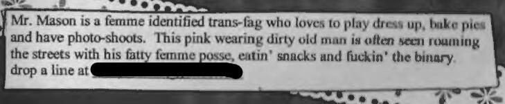 (ID: A screenshot of an archived zine, in black and white. It reads: "Mr. Mason is a femme identified trans-fag who loves to play dress up, bake pies and have photo-shoots. This pink wearing dirty old man is often seen roaming the streets with his fatty femme posse, eatin’ snacks and fuckin’ the binary. drop a line at". The email address after "drop a line at" is redacted with a black stripe.)